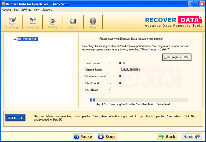 Recover Data for Pen Drive software scan the selected partition to recover possible data.