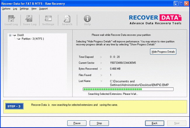 Recover Data for FAT & NTFS is now searching for selected extensions in the selected partition and saving the selected file in the selected destination path as follows: