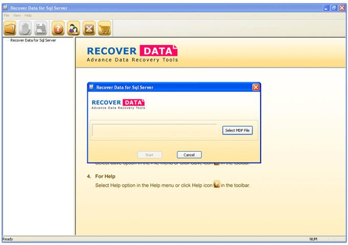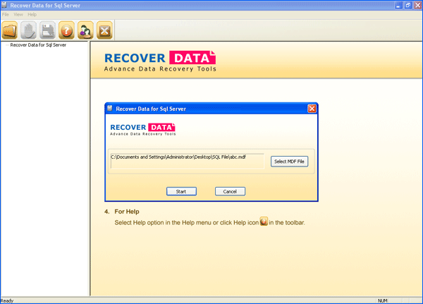 Step - 1 » Start up Screen of Recover Data for SQL Server Software (click browse to located & select the corrupt (.mdf) file of the database that needs to be recovered).