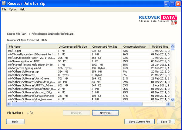 After selecting Zip files, software display following screen:
