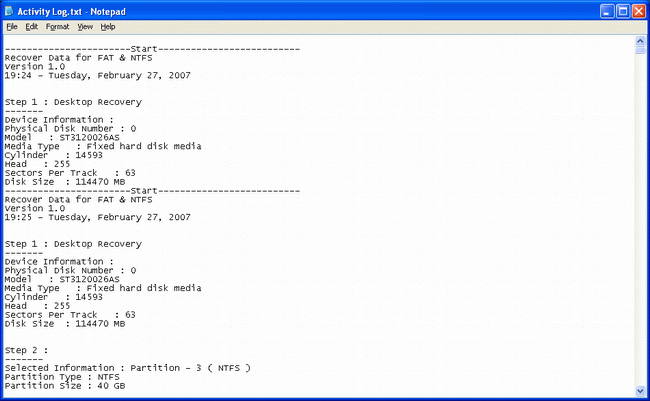Recover Data for FAT & NTFS will show you a notepad file namely Activity Log.txt containing Activity Report of the Software as follows: